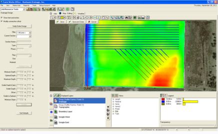 Soluções de gestão da água de superfície e de subsuperfície. Ajudam os usuários a identificar o posicionamento ideal de drenos de tubo e de superfície em projetos de gestão de água de drenagem de superfície e subsuperfície, além da definição de taipas ou terraços em nível. Visualize dados topográficos do campo em 3D de qualquer ângulo e exagere a vertical para visualizar a forma e as encostas do campo. Utilize as ferramentas de desenho para ligar as linhas laterais às principais, criar espaçamento lateral paralelo e fixar linhas de drenagem. Formate e projete tubulações de drenagem por tamanho, tipo de tubo e fase e depois insira a profundidade mínima, profundidade máxima e grau ideal para cada uma.